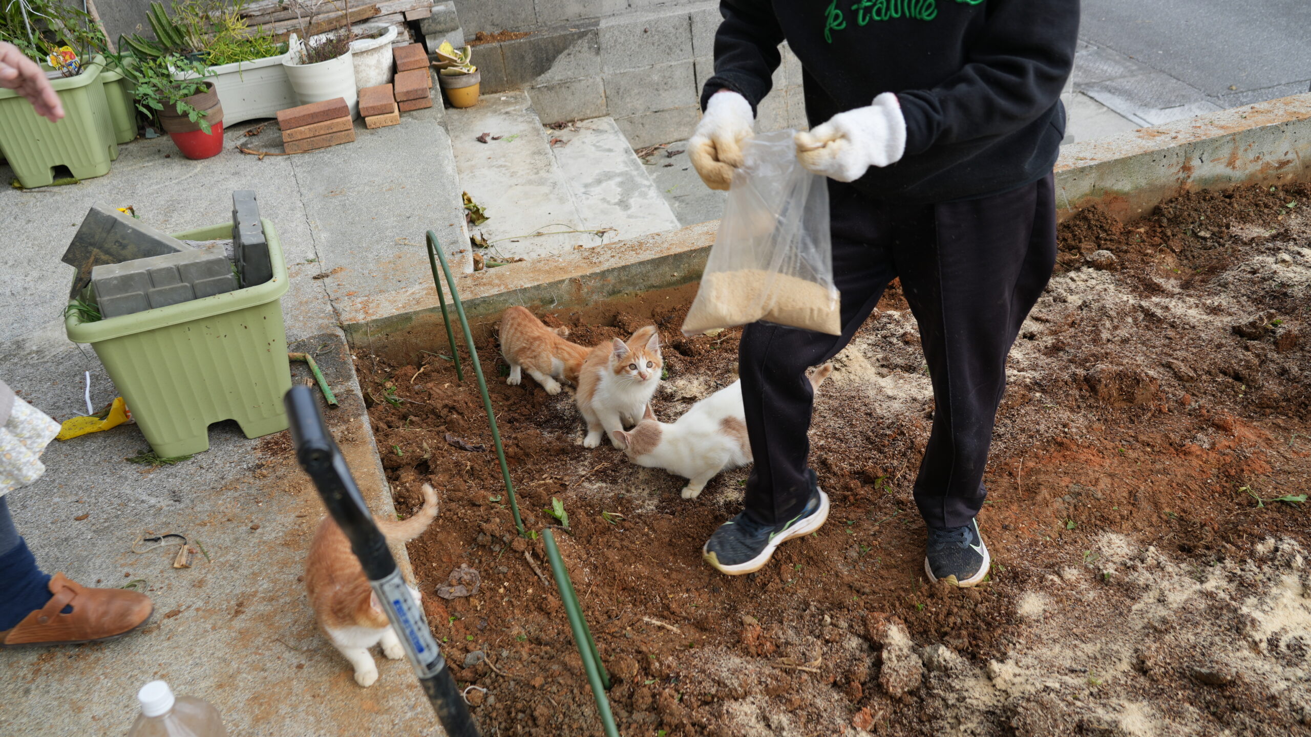 米ぬかを巻いてると子猫ちゃんたちが戯れてきた