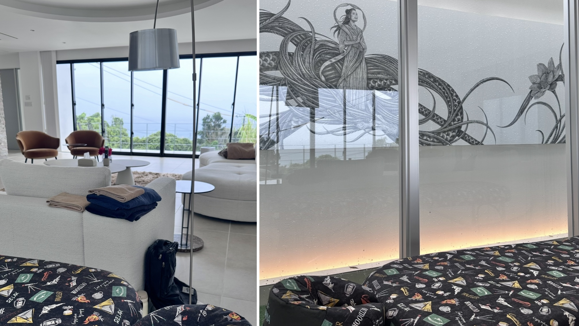 リビングの中心には、点描画家 大城清太さん の大きな作品がどどーんと飾られていました。